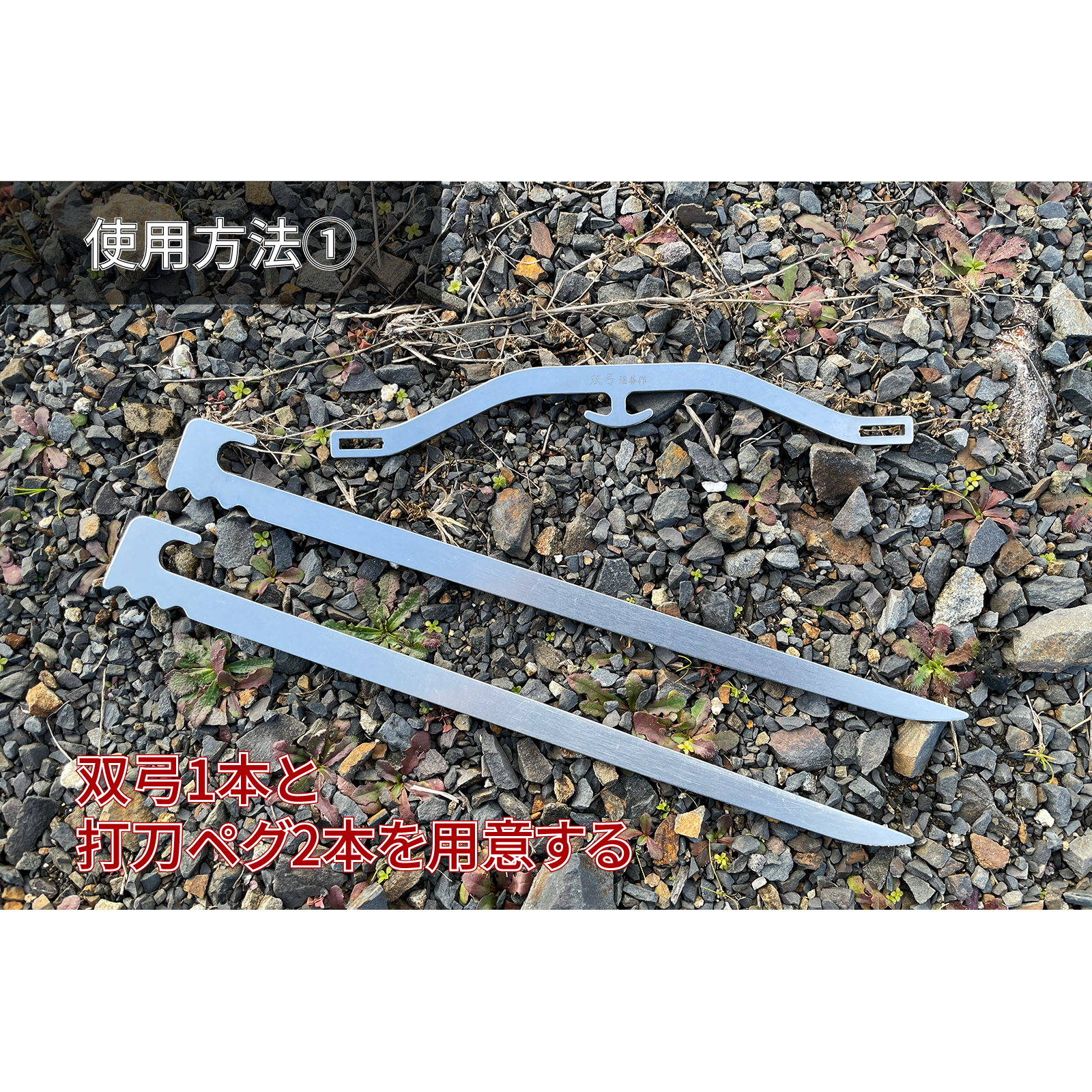 本製品は2本の打刀ペグ使用時の地面への固定力を増加させるパーツ『双弓(ふたゆみ)』2本セットです。