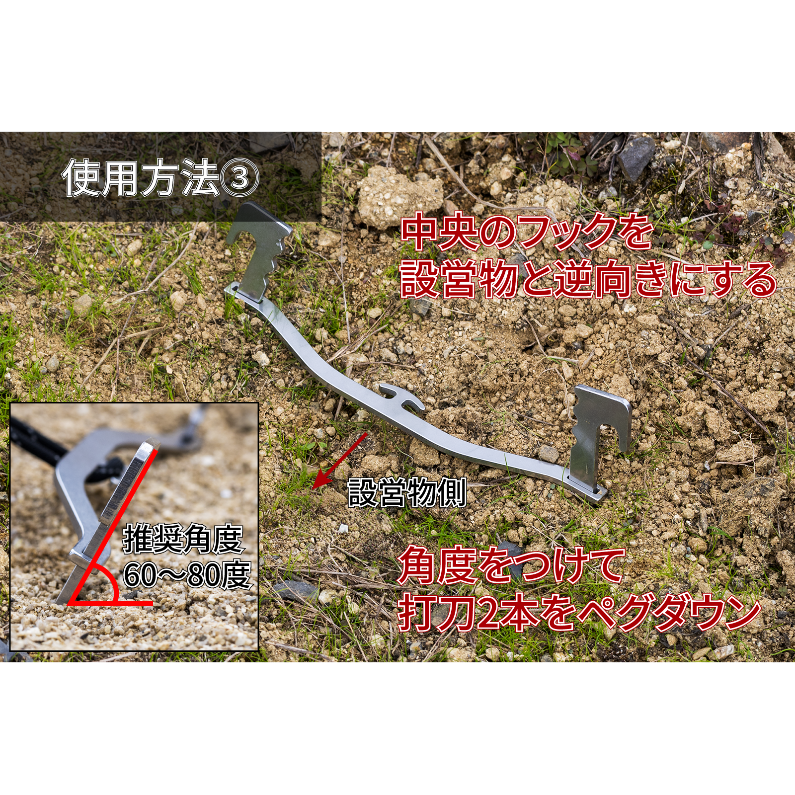 3.中央のフックを設営物と逆向きにし、角度をつけて打刀2本をペグダウンします(地面との推奨角度:60~80度)