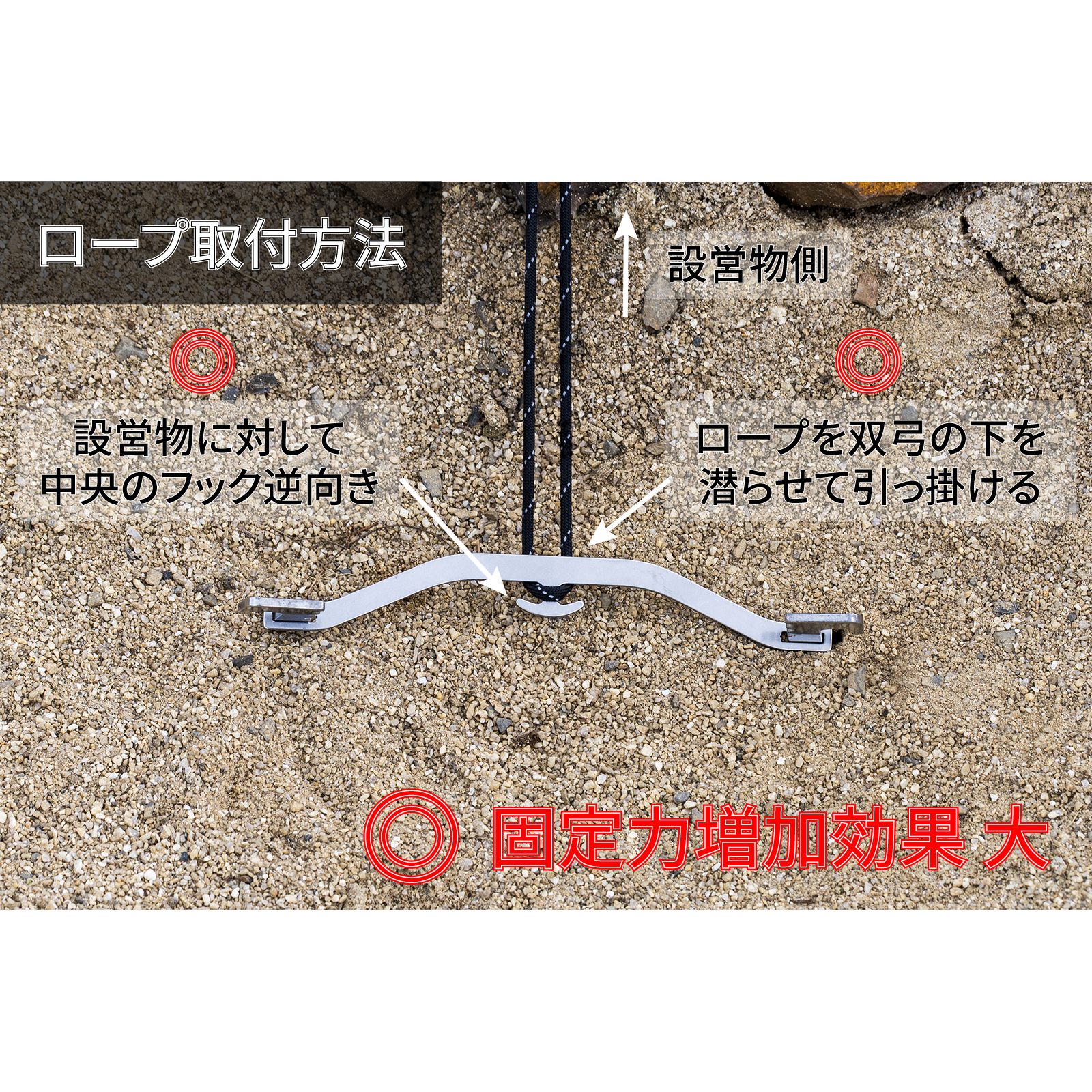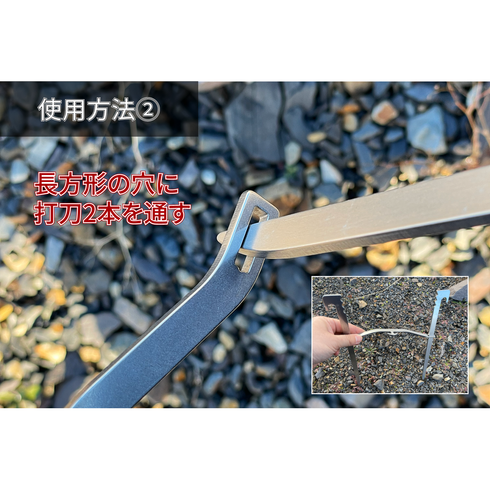 双弓の左右に配置された長方形の穴に2本の打刀を通し、一緒にペグダウンを行うことで地面への固定力が向上します。