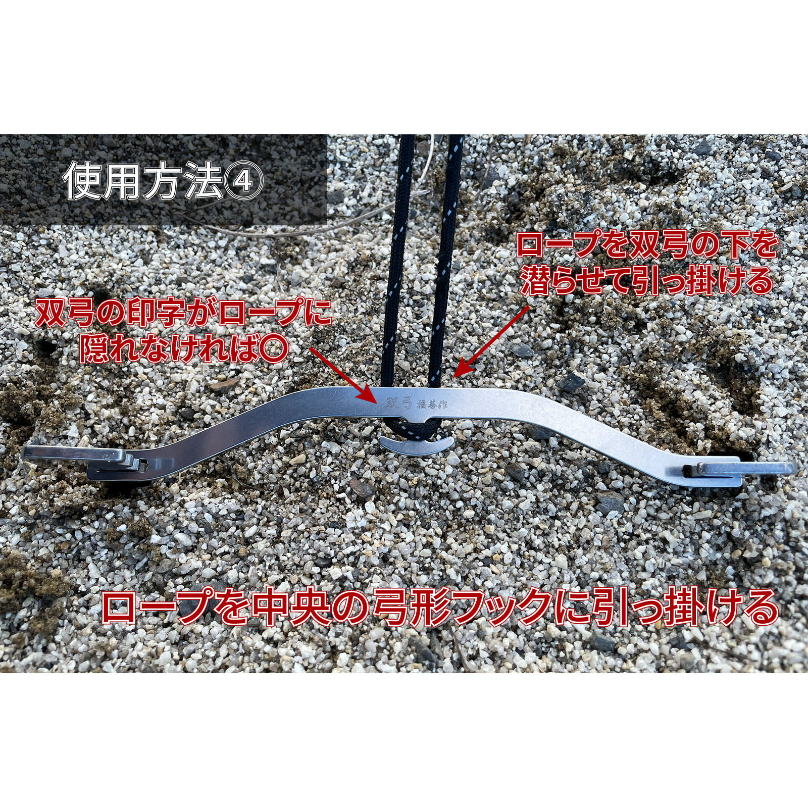 4.ロープを中央の弓形フックに引っ掛けます(※ロープは双弓の下を潜らせてください→双弓の印字がロープに隠れなければ〇)