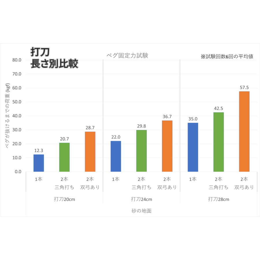 打刀も他のペグ同様にクロス打ちにて固定力が増加するのかを検証し、効果があることを確認しておりますが、更に固定力を増加させる方法を模索したところ、打刀ペグ2本を少し離して水平に打つ方法(三角打ち)にて最も優れた結果得られることが分かりました。